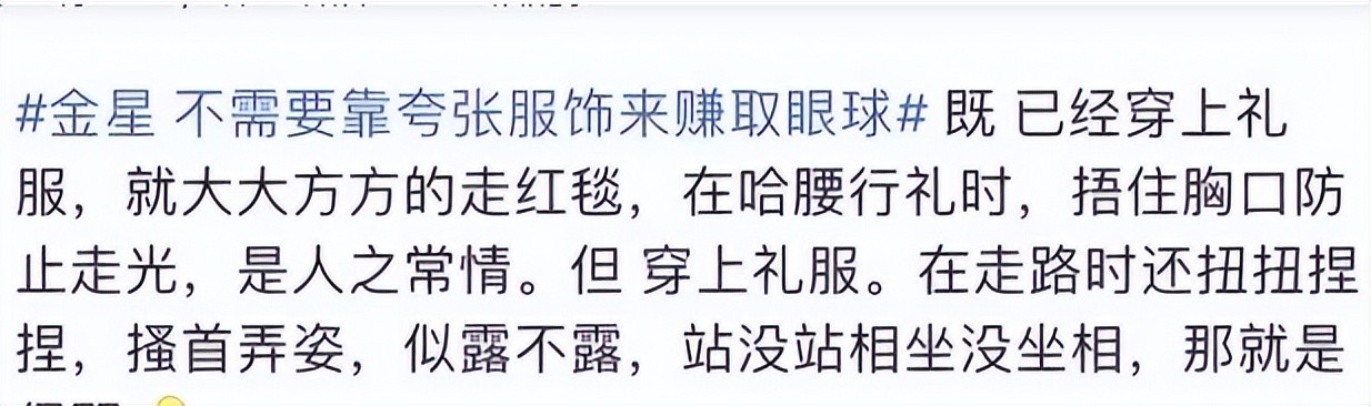 最让人气愤的还是,金星说的真正有实力的演员从来不需要穿着夸大的服装赚取眼球,这不是摆明就是含沙射影吗?谁能够忍呢,而迪丽热巴的身材也是一直被各种拿来营销,作品却一直都是反响平平,金星这么说确实没有说错