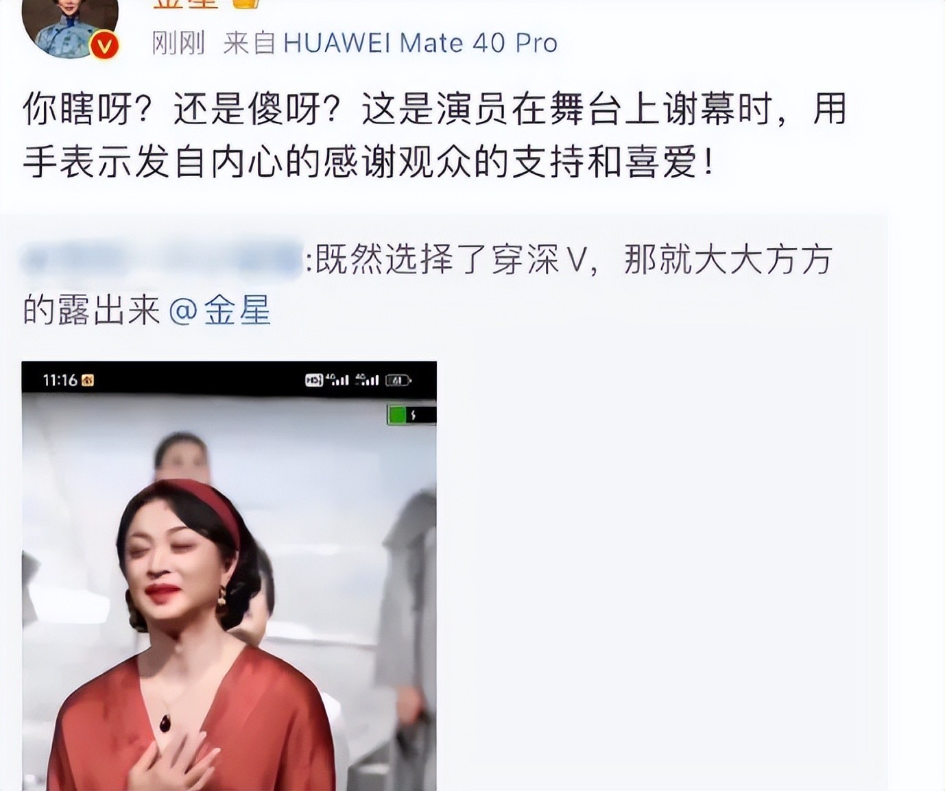 好巧不巧,金星说的穿着v领衣服却一直捂着xiong部,和迪丽热巴完全一样,很多人也是开始各种保护自己的爱豆,金星也是一直在发布自己的言论完全不顾及别人的看法,就连迪丽热巴讨伐的粉丝都没能够逃过“毒舌”的攻击