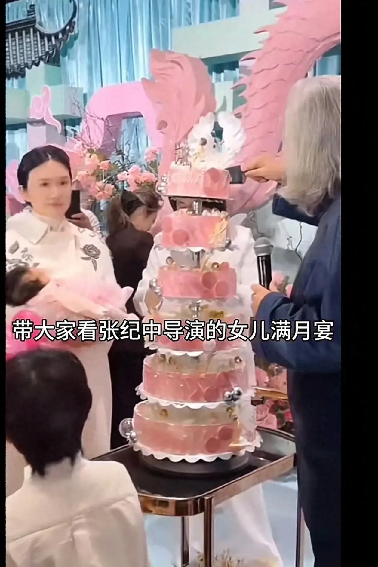 张纪中夫妇通过直播方式向外界分享这场满月宴。现场布置以家庭风格为主,简单温馨,但显得有些过于“接地气”。