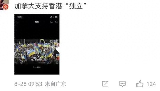 不过,不少中国网友发现,加拿大大使馆向贴文分发的视频中,出现了一面写有“港独”口号的旗帜。