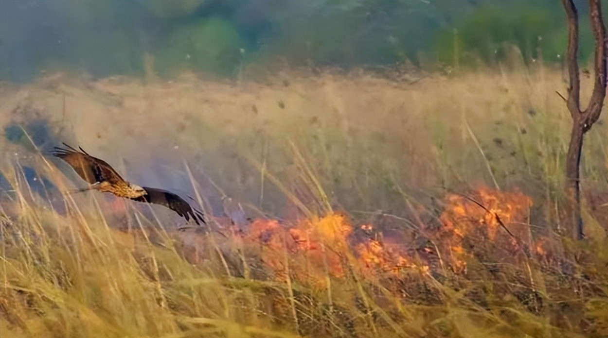 火灾发生后,躲在草丛和林木间的动物都会逃窜而出,此时就是黑鸢捕猎的最佳时机。