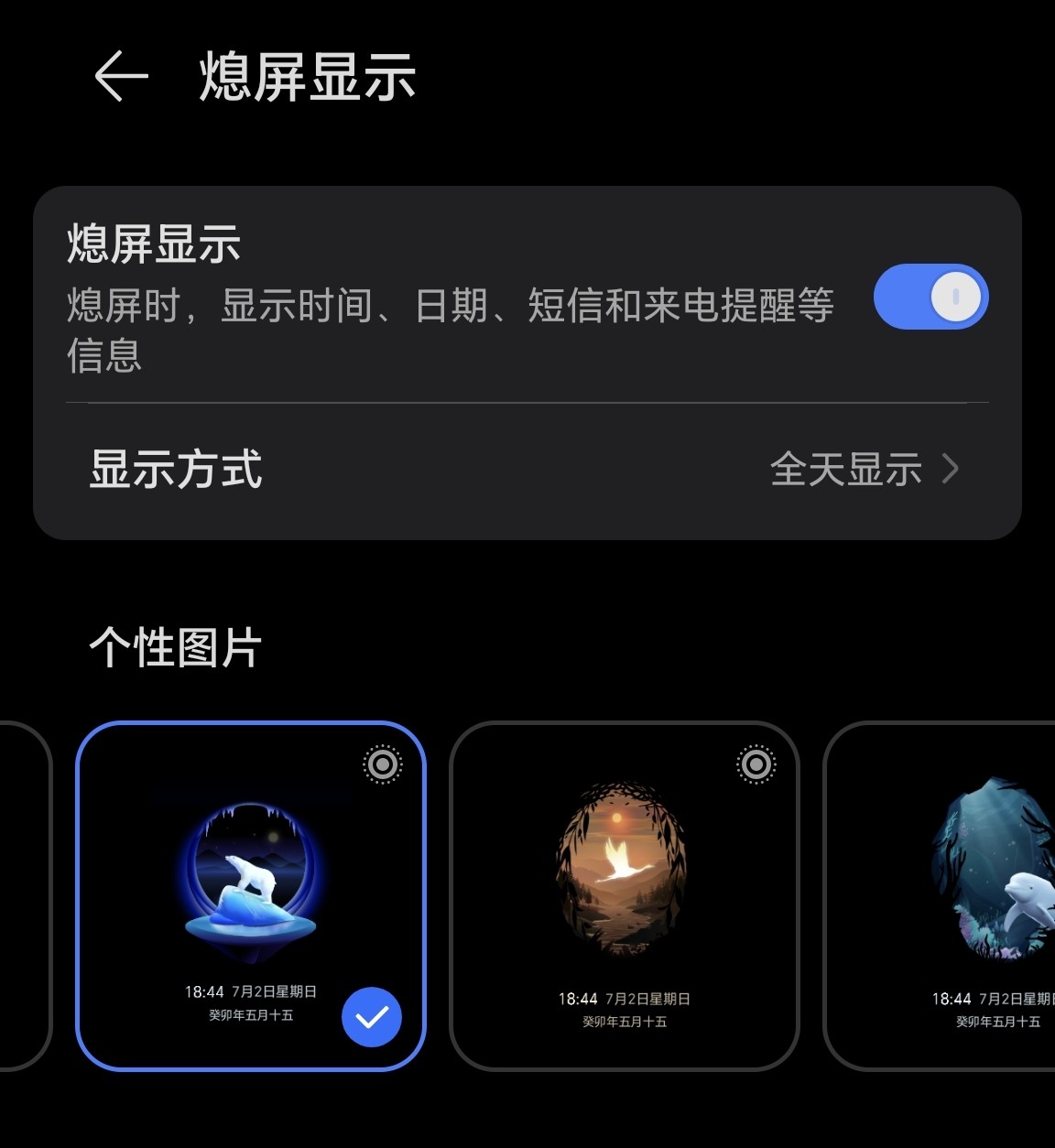 进入“显示方式”选项,可以将显示方式切换成轻触显示、定时显示或全天显示。如果选择“全天显示”,则手机在熄屏状态下,也能在屏幕上看到当前时间、日期等信息。