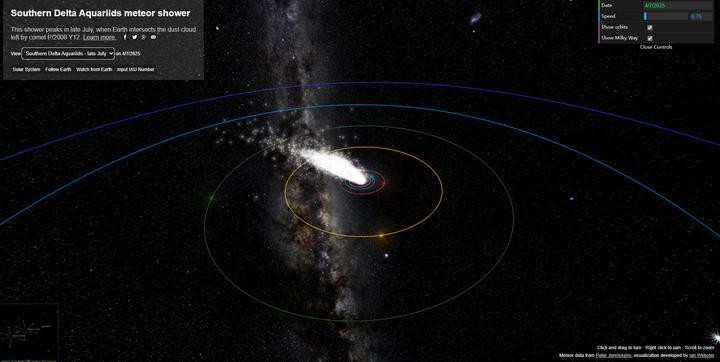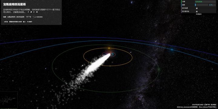这是一个可以观看流星雨的网站,拖动鼠标移动,还能转动、平移、缩放等,界面左上侧展示各种星座的流星雨及其时间,我们可以随机挑选,实现在线许愿!