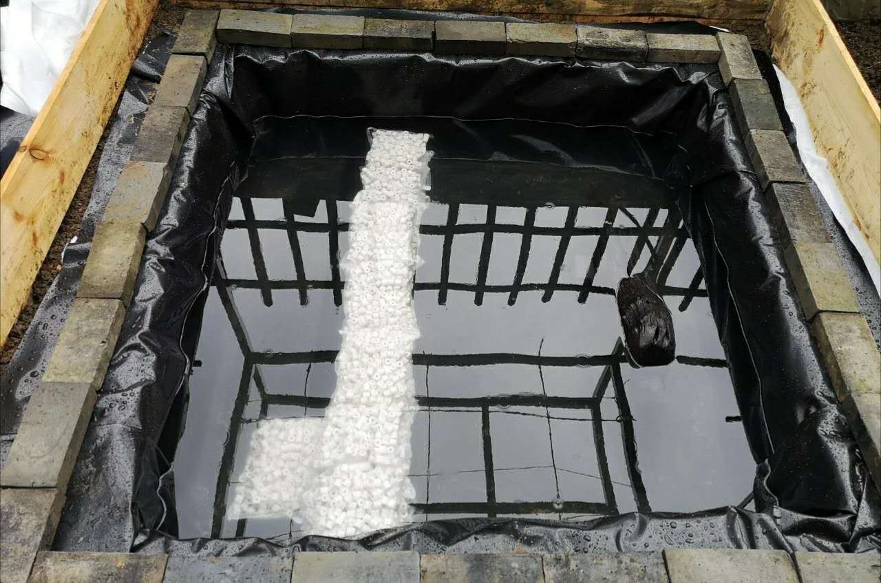 其次采用的是土工布和防渗布结合,进口防渗布无毒,耐晒,比想象中的要硬好像软卡纸一样,耐划但是不耐扎,所以池壁及池底必须要整平剔除杂物并铺上土工布加以保护提供缓冲。