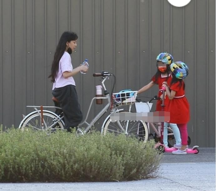 期间,李靓蕾带着一对女儿在公园骑单车,边玩边等爸爸。