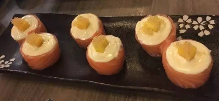 三文鱼完整的圈住了饭团,上面覆满奶黄色的沙拉酱汁,点缀黄色蟹籽粒,口感非常棒,而且分量足,十分新鲜,沾上芥末,美味可口。