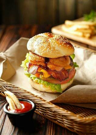 @好猫扑扑:海陆总汇双层汉堡:图片与实物相符,很大一个,味道还行,美式的粗狂风格,很厚,一口想咬到每一层不太可能。