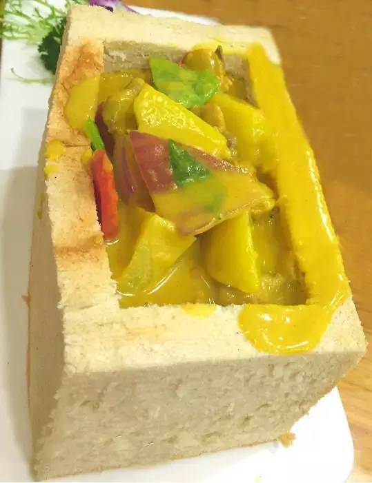 咖喱面包鸡与其他店的面包诱惑有异曲同工之处,面包挖空,中间放有咖喱炖土豆和鸡,咖喱很浓味道很独特,鸡肉分量也足,让人吃得过瘾。