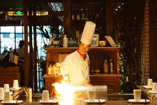 @唯听雨:服务很热情,有帅哥厨师专门给我们做菜,一边做着铁板烧一边表演火焰特技,晚上7点的时候厨师们集体跳热舞,气氛特别high!菜是现做现吃的,有什么需求直接跟厨师说,黑椒汁煎牛仔骨超级好吃,在搭配老火虫草花红枣炖乌鸡汤滋润下自己,简直完美。人均消费才六十多元的这家店,不仅东西好吃,还能看表演,有种VIP的感觉。