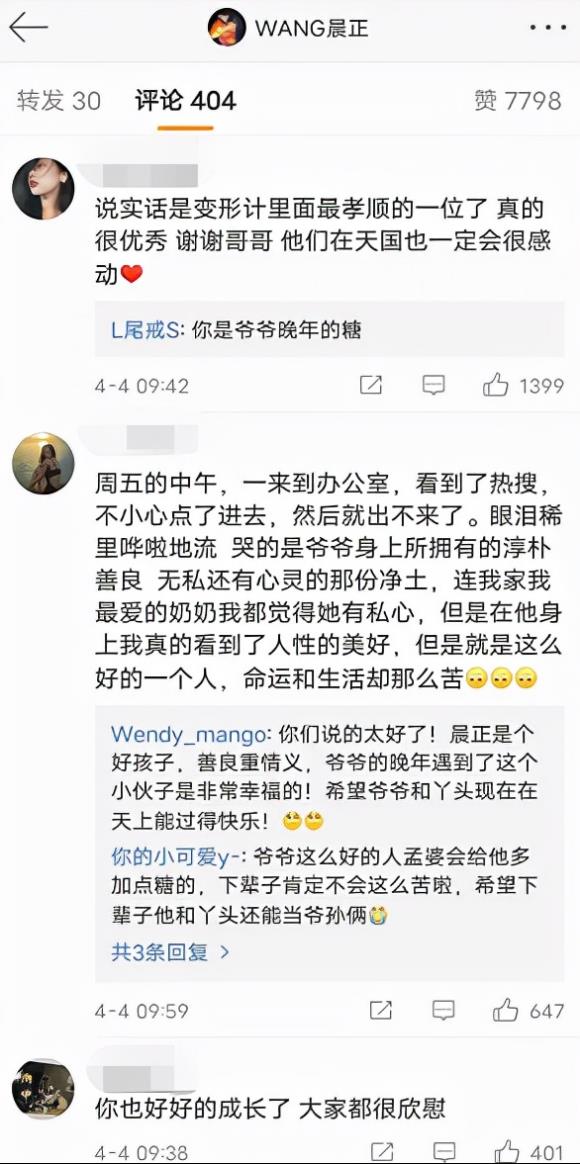 王晨正的善良感动了无数人。很多人说:“爷爷晚年遇见你,是他的福气”