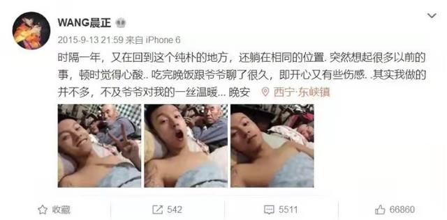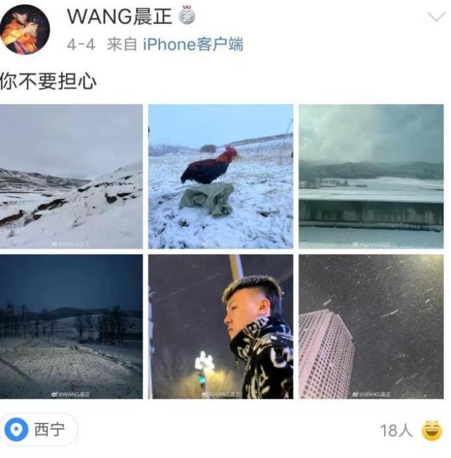 王晨正在微博上更新状态。有白雪皑皑的村庄,有爷爷养的鸡,一望无际的山路,还有一张自己的照片。
