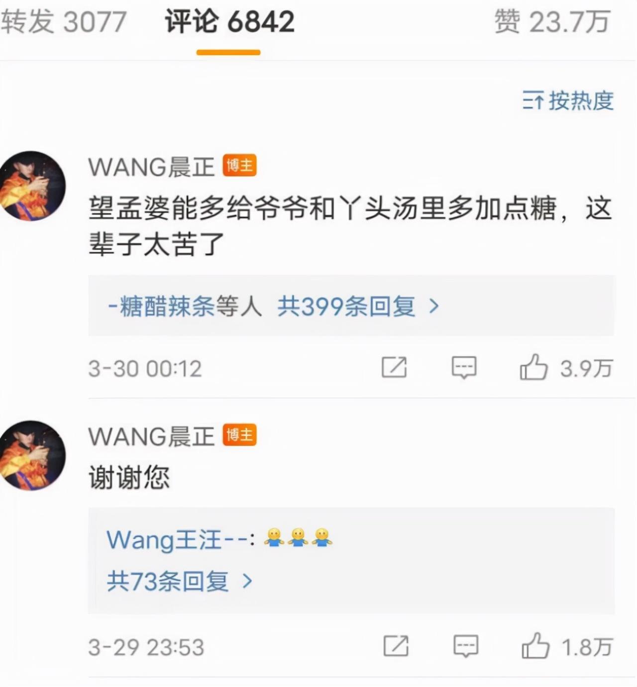 非常伤心的王晨正在评论区留言:“希望孟婆婆能在爷爷和姑娘的汤里多加点糖,他们这辈子太辛苦了”