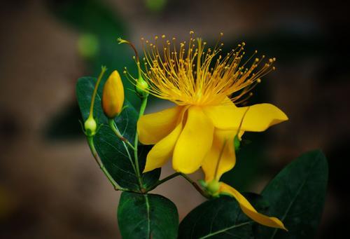 金丝桃花叶秀丽,花冠如桃花,金黄色的花瓣,经阳光一照,熠熠生辉,更加耀眼夺目;而修长细密的花蕊灿若金丝,更显风情万种。