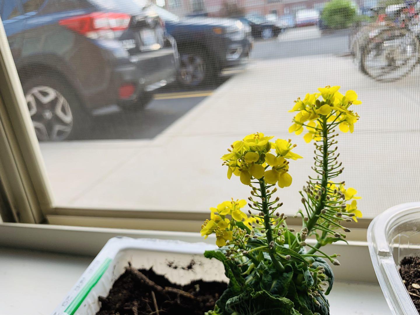 前几天,一颗白菜头被我扔进阳台的花盆里,正所谓“无心插柳柳成荫”,这几天居然开花了,黄色的小花,不似红花娇艳欲滴,蓝紫色梦幻清幽,却有独特的天真、快乐、明亮,使人兴高彩烈,充满喜悦之情。