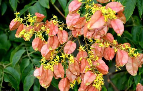 秋季开花,花为黄色,蒴果熟时红褐色,果皮膨大成灯笼状,花果同观,色彩丰富。