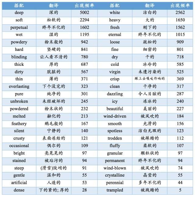 根据检索结果,我们按照搭配出现的频率由高到低制作了一个表格,可以看到英语中与雪搭配的形容词包含了雪的颜色、硬度、是否纯净、时间、大小等等各维度,而deep, white, soft等词高居榜首。
