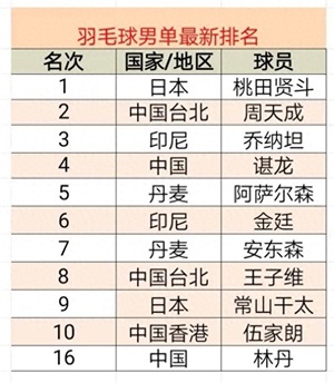 1、首先,如果评选羽坛男单新四大天王的话,参选运动员的世界排名一定要在世界前十以内,或者曾经长时间排名前十,只是因一些原因暂时被挤出前十之外。