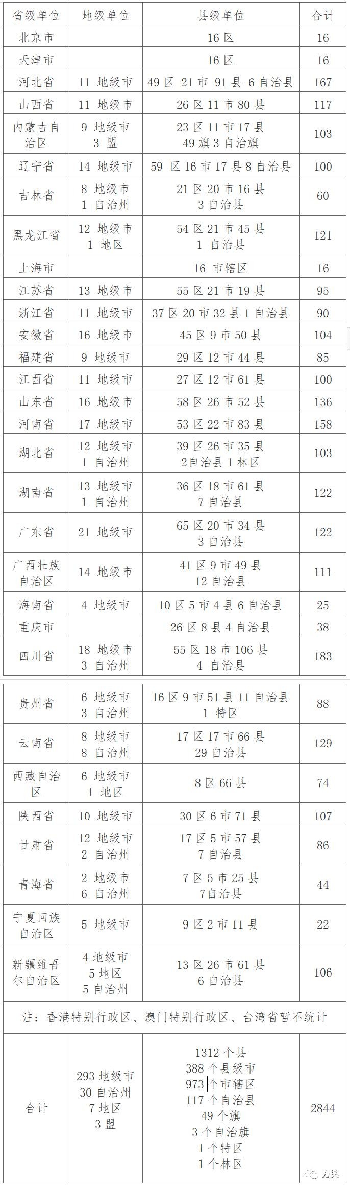 截至2020年7月,全国共有34个省级行政单位,333个地级行政单位,2844个县级行政单位。