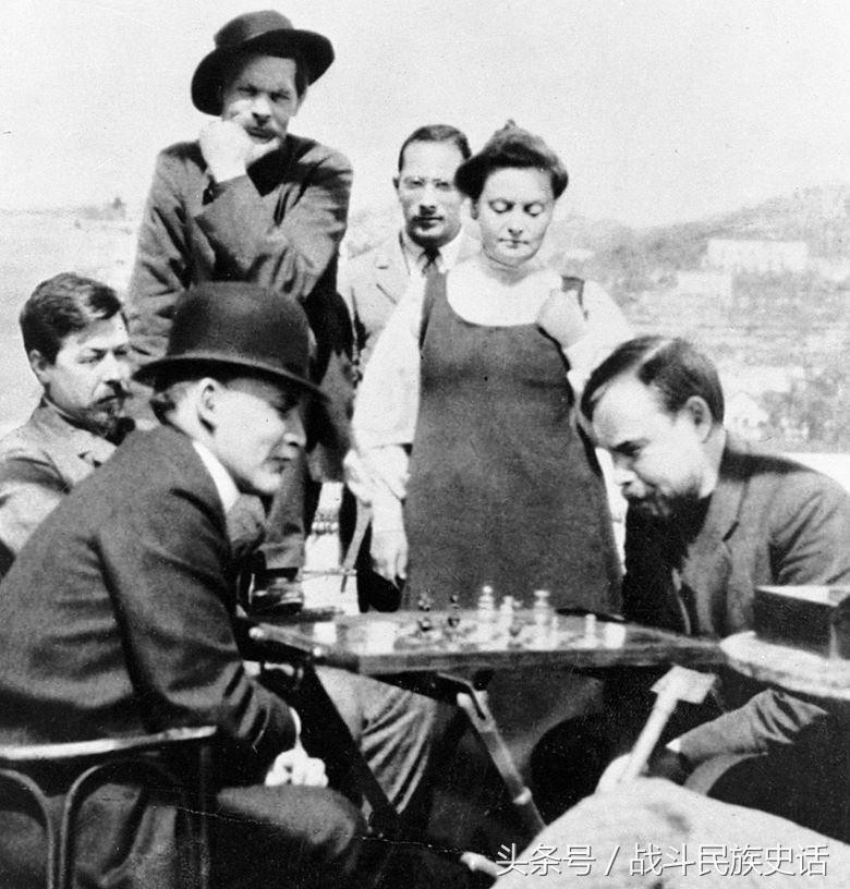1908年,列宁(右侧)与俄罗斯科学家和革命家亚历山大·波格达诺夫下国际象棋,当时著名作家高尔基(后面站着戴帽子那位)也在。