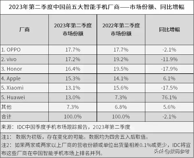 市场调研机构IDC今天公布了2025年第二季度中国手机市场份额数据,根据这个数据,OPPO、vivo、荣耀成为排名前三的厂商,这三家市场份额都超过了苹果,而小米和华为紧随其后。