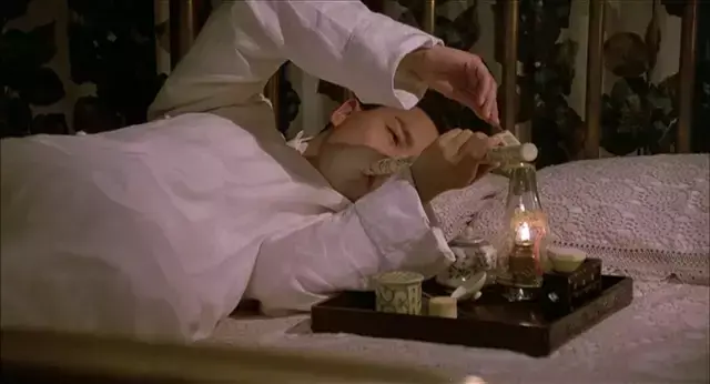 在两人赴死的那个晚上,如花递过鸦片,陈振邦却流露出犹豫和害怕的情绪,喝了口酒。