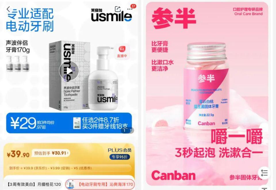 如云南白药牙膏在不同香型的牙膏包装上印有麻辣火锅、酸菜、汤圆等餐饮场景;而参半则针对正畸期间的清洁需求,推出更便捷的益生菌固体牙膏粒;Usmile 则推出电动牙刷专用的声波伴侣牙膏,以 " 二氧化硅微粒,温和清洁顽渍,不伤牙釉质 " " 云柔密泡,口腔泡泡浴 " 为卖点。