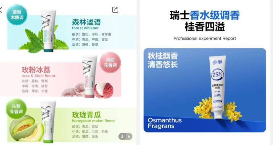此外,一些品牌的牙膏口味还向香氛靠拢,如参半羟基磷灰石牙膏,香型是满陇桂雨(桂花味),并宣称是 " 瑞士香水级调香 ";华熙生物 WO 牙膏,口味上甚至还分为前调、中调、后调,专业程度向大牌香水看齐。