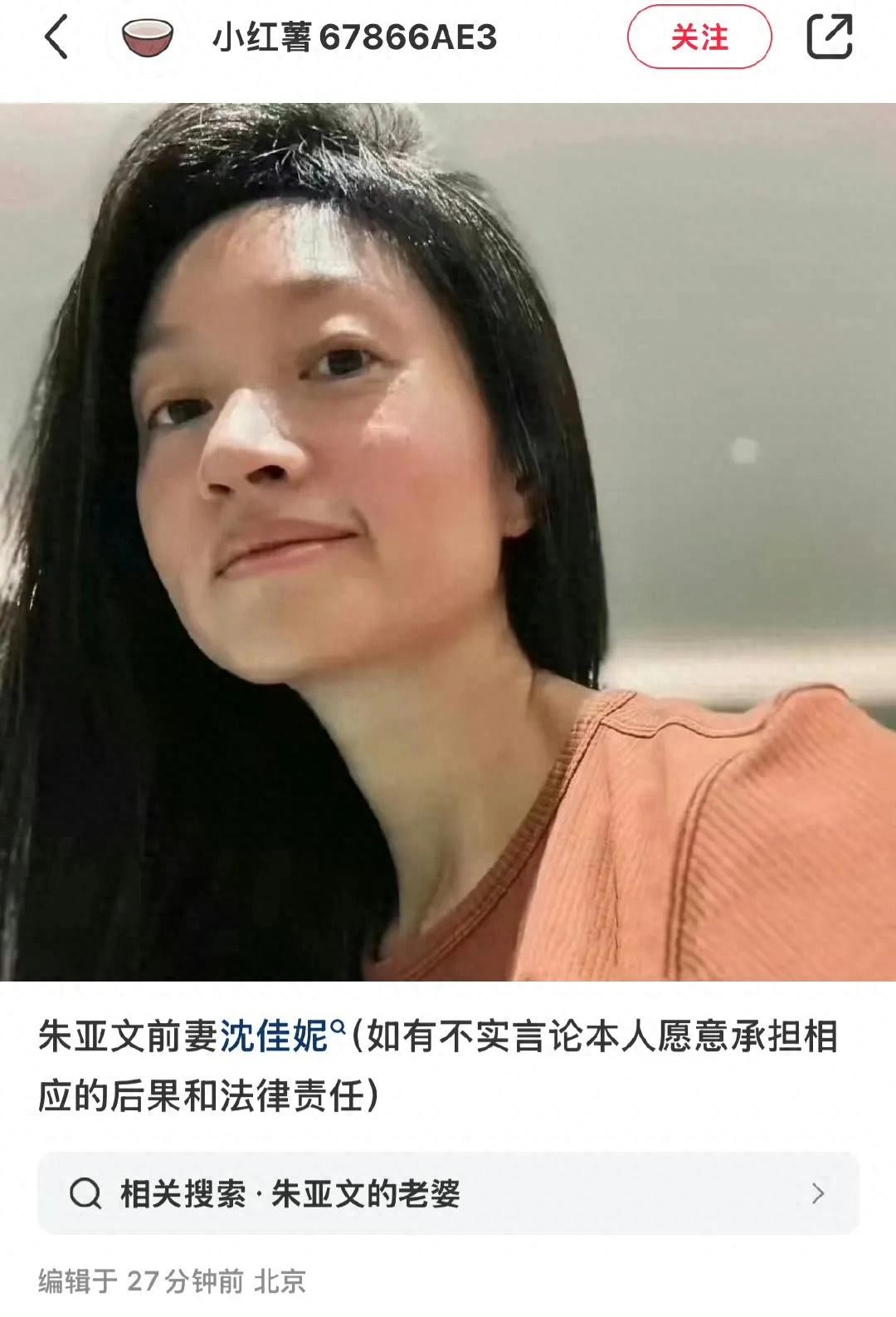 2025年1月21日,网友在平台上发布了一张沈佳妮的照片,并配文:“朱亚文前妻沈佳妮(如有不实言论本人愿意承担相应的后果和法律责任)。