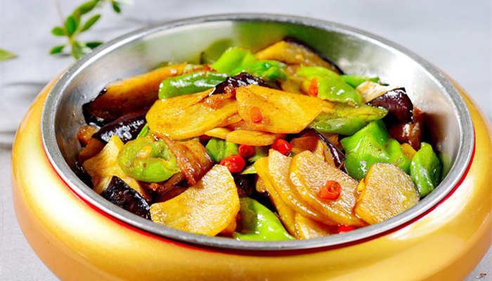 3、锅中热油,油热后放入茄子中小火炸3分钟,土豆炸10分钟,青椒炸10-15秒即可。