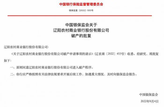 最近,银保监会发布两则批复显示,原则同意辽阳农村商业银行股份有限公司、辽宁太子河村镇银行股份有限公司进入破产程序。